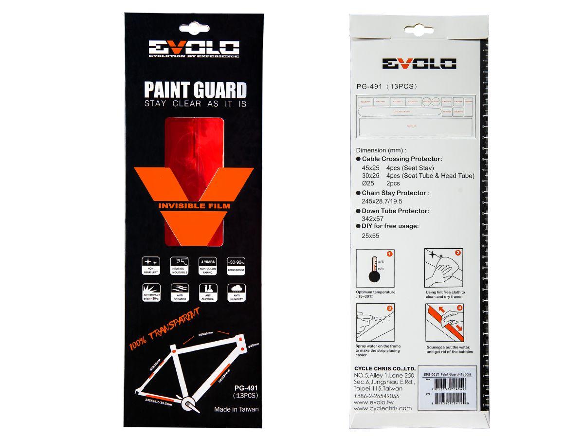 EVOLO保護貼各尺寸使用對應位置圖及使用方式: (1) 清潔黏貼區域,確保無灰塵髒汙 (2) 黏貼時建議於周遭環境溫度15°C~30°C,如車架在戶外曝曬,建議移至陰涼處或室內約30分鐘後再行施作黏貼。 (3) 確認位置後輕貼於上,再輕刮出氣泡,最後以吹風機溫熱風吹拂塑形 |